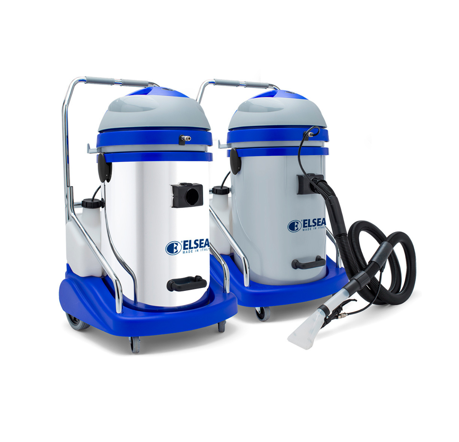 Para utilizarlo, introduce el detergente específico en el depósito (20 l) y conecta el tubo del detergente a la conexión «IN». Luego, conecta la manguera de succión al aspirador y al cuerpo del cepillo. El botón verde activa la bomba de succión de detergente, mientras que el botón rojo activa la succión de la suciedad, dejando la superficie limpia y seca.